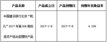 关于中国建设银行北京“乾元”2017年第006期标准资产组合型理财产品成立的公告
