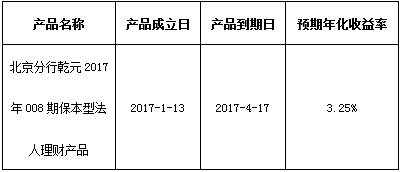 关于北京分行乾元2017年008期保本型法人理财产品成立的公告