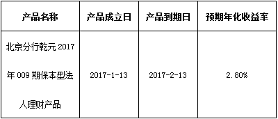 关于北京分行乾元2017年009期保本型法人理财产品成立的公告