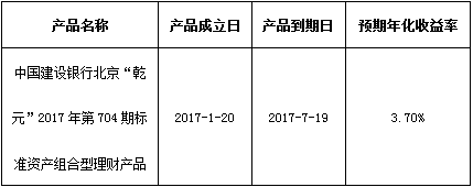 关于中国建设银行北京“乾元”2017年第704期(电子渠道专享)标准资产组合型理财产品成立的公告