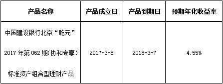 关于中国建设银行北京“乾元”2017年第062期(协和专享)标准资产组合型理财产品成立的公告