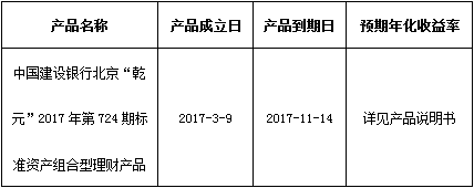 关于中国建设银行北京“乾元”2017年第724期标准资产组合型理财产品成立的公告