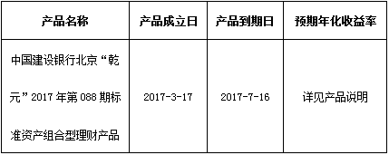 关于中国建设银行北京“乾元”2017年第088期标准资产组合型理财产品成立的公告