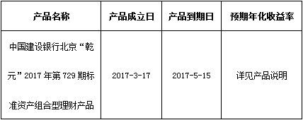 关于中国建设银行北京“乾元”2017年第729期标准资产组合型理财产品成立的公告