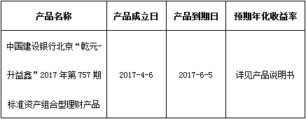 关于中国建设银行北京“乾元-升益鑫”2017年第757期标准资产组合型理财产品成立的公告