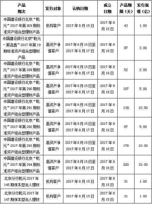 中国建设银行北京市分行定于2017年8月15日发行理财产品,现将相关发行情况公告如下: