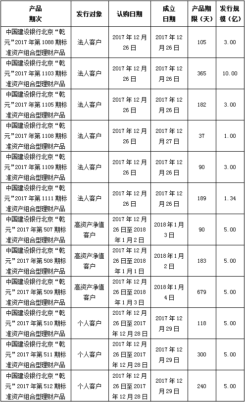 建行北京市分行理财产品发行公告2017年12月26日