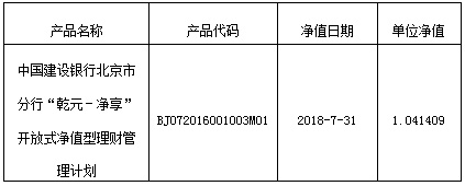 中国建设银行北京市分行“乾元-净享”开放式净值型理财管理计划净值公布如下: