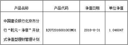 中国建设银行北京市分行“乾元-净享”开放式净值型理财管理计划净值公布如下: