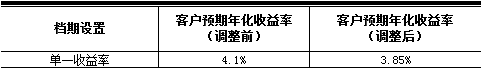 新客户预期年化收益率于2019年4月12日(含)起执行。对于2019年4月12日(不含)前已经购买成功且未赎回的存量投资本金,其中封闭期内的份额仍按照购买确认日当日的客户预期年化收益率计算投资收益,非封闭期内的份额从2019年4月12日(含)起按调整后的预期年化收益率计算投资收益。2019年4月12日(含)后购买的部分自动执行调整后的客户预期年化收益率。但前述情形下的最终投资收益均以我行最终支付的实际年化收益率为准。