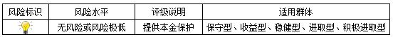 本期产品为保本浮动收益型理财产品,本理财产品有投资风险,只保障理财资金本金,不保证理财收益,您应当充分认识投资风险,谨慎投资。本期产品期限为37天(中国建设银行有权对产品进行展期或提前终止)。本期产品内部风险评级级别为一盏警示灯,风险程度属于无风险或风险极低,适用于保守型、收益型、稳健型、进取型及积极进取型投资者。最不利情况下,客户只能收回投资本金,不能获得任何投资收益。