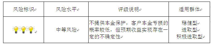 本期产品为非保本浮动收益型理财产品,不保证本金和收益,请您充分认识投资风险,谨慎投资。本期产品期限99天(中国建设银行有权对本期产品进行展期和提前终止),存续期内产品不接受申购或赎回申请。本期产品内部风险评级级别为3盏警示灯,风险程度属于中等风险。最不利情况下,资产组合无法回收任何本金和净收益,客户将损失全部本金。产品适合于稳健型、进取型及积极进取型客户。