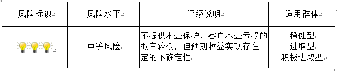 本期产品为非保本浮动收益型理财产品,不保证本金和收益,请您充分认识投资风险,谨慎投资。本期产品期限99天(中国建设银行有权对本期产品进行展期和提前终止),存续期内产品不接受申购或赎回申请。本期产品内部风险评级级别为3盏警示灯 ,风险程度属于中等风险。最不利情况下,资产组合无法回收任何本金和净收益,客户将损失全部本金。产品适合于稳健型、进取型及积极进取型客户。