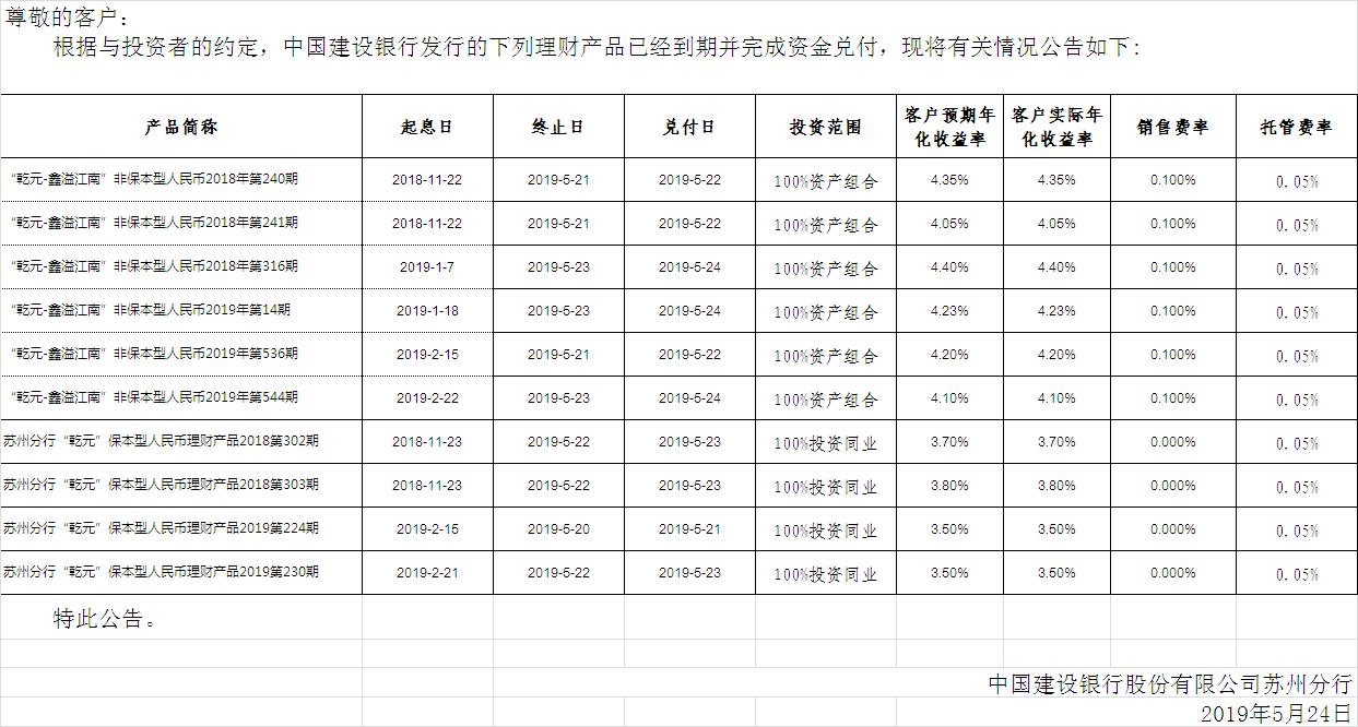 中国建设银行理财产品终止及清算公告